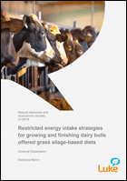 The main objective of this thesis was to elucidate the effects of different restricted energy intake strategies on performance of growing dairy bulls, especially growth rate, feed efficiency, carcass fatness and meat quality. Energy intake was restricted by restricting concentrate or total diet dry matter (DM) intake (DMI), either periodically or during the whole growing period. The target was to achieve steady, increased or decreased growth patterns with diets based on grass silage and barley grain.